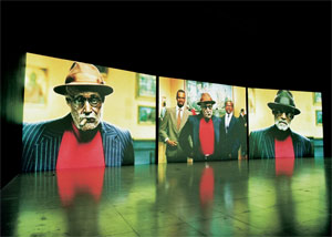 It is hard to avoid the conclusion that this represents a statement of the artist’s own sense of his (and our?) existence. He hopes every day to achieve success in the charcoal cloud which he creates as he works diligently on his sheets of paper, creating graphic images of himself. He repeats his actions, going up and down that low stool over and over again. Having got onto it the first time, he says “SO”, which could mean “so what?” or something completely different. Off he goes, doing it again. He runs into the red barrier, which might be his own blood, but off he goes again, and finally realizes that he is facing his mortality as the grey pages he is creating pass by over and again. The earth, maybe a dark moon, and a globe on a stand complete the sense of Time and its passing.