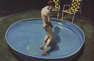 This was the beginning of his move into full-colour, traditional oil paintings. The next major work was Sleepwalker. On a six by nine foot canvas, an adolescent boy stands in a child’s pool on a suburban lawn at night, in a still darkness. Far from awareness, he is masturbating into the pool.